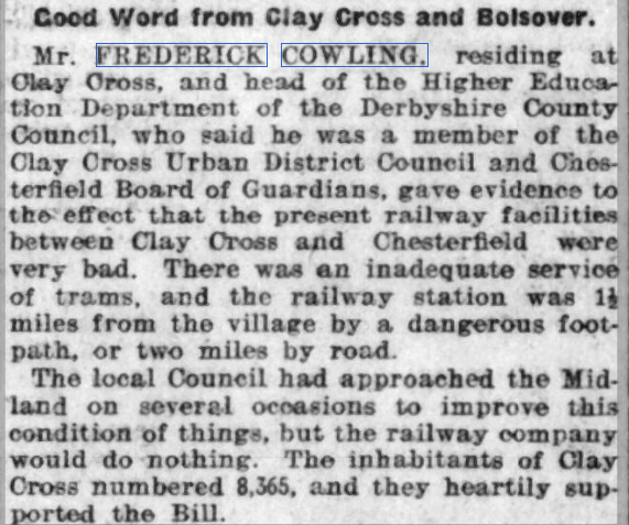 - Derbyshire Times and Chesterfield Herald 18 November 1903. Chamberlain’s Shibboleth. “Will die the death of a dog”. Liberal address at Clay Cross. Under the auspices of the Clay Cross Liberal Association, Mr. F. Cowling F.C.S. gave an address on the fiscal policy in the Clay Cross Primitive Methodist School on Friday evening last. Mr. F. Kenning, J.P., presided. ↩︎