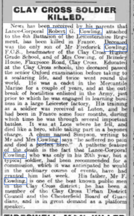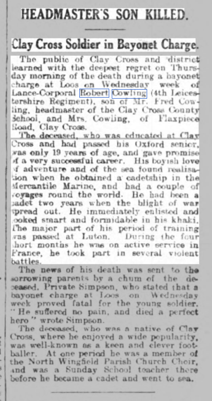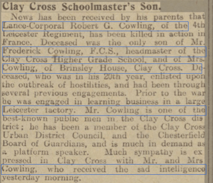 Appendix B Sheffield Daily Telegraph, Saturday 23rd October 1915 Derbyshire Courier, Saturday 23rd October 1915(The same article and picture in Derbyshire Courier on Tuesday 26th October 1915) Belper News and Derbyshire Telegraph, 29th October 1915 Share this: Share on X (Opens in new window) X Share on Facebook (Opens in new window) Facebook Like Loading...